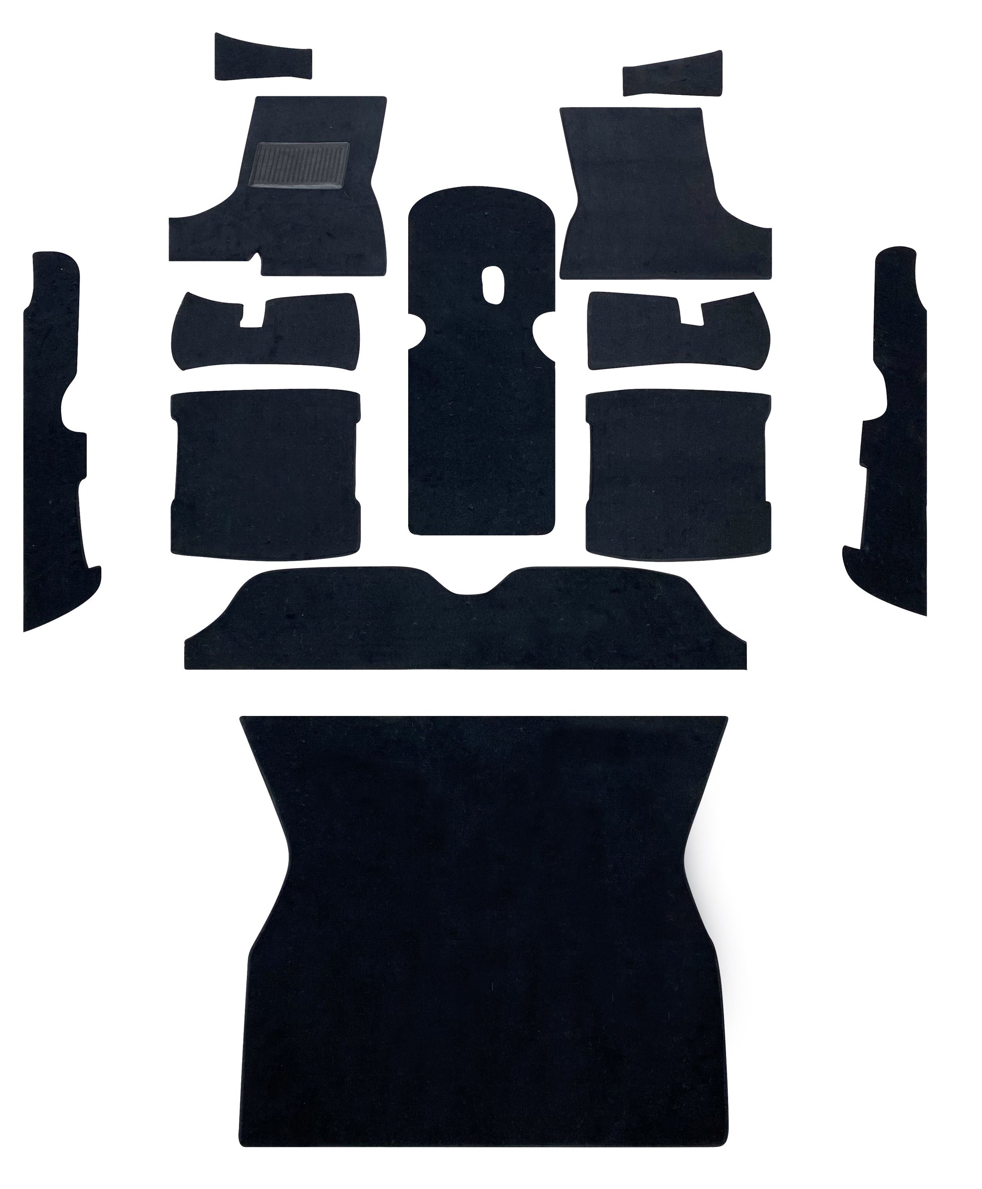 The kit includes two main floor pieces, one for the front and one for the rear, and covers from the firewall to the front of the rear seat. It also includes one bucket seat flap to cover the area between bucket seats, if you have them.